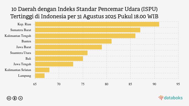 Berikut daftar 10 provinsi dengan indeks kualitas udara terburuk di Indonesia pada Minggu, 31 Agustus 2025 pukul 18.00 WIB.