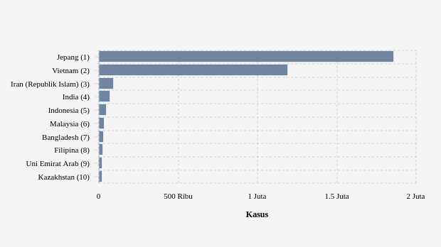 Kemudian, Malaysia dengan 30,99 ribu orang berada di urutan 3, Philippines dengan 24,18 ribu orang berada di urutan 4 dan Thailand dengan 15,75 ribu orang berada di urutan 5.