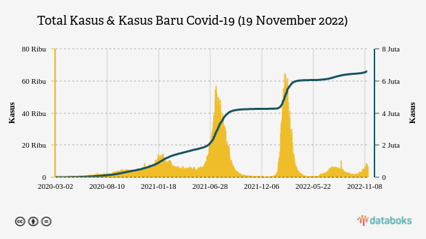 Pasien positif Covid-19 bertambah 6.383 orang per 19 November 2022. Dengan tambahan tersebut, saat ini total kasus Covid-19 di Indonesia telah mencapai 6.603.195.