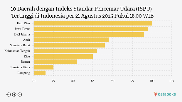 Berikut daftar 10 provinsi dengan indeks kualitas udara terburuk di Indonesia pada Kamis, 21 Agustus 2025 pukul 18.00 WIB.