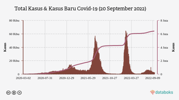 Pasien positif Covid-19 bertambah 2.518 orang per 20 September 2022. Dengan tambahan tersebut, saat ini total kasus Covid-19 di Indonesia telah mencapai 6.412.944.
