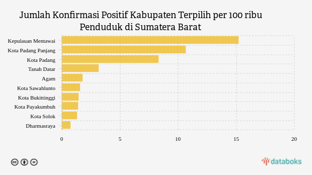 Jumlah penambahan konfirmasi positif Covid-19 di Sumatera Barat saat ini paling tinggi terjadi di Kepulauan Mentawai dengan jumlah 15,18 kasus per 100 ribu penduduk per minggu pada Selasa, 23 Agustus 2022. Angka ini selisih empat kasus dibandingkan catatan kasus di wilayah lain yang berada di urutan kedua.