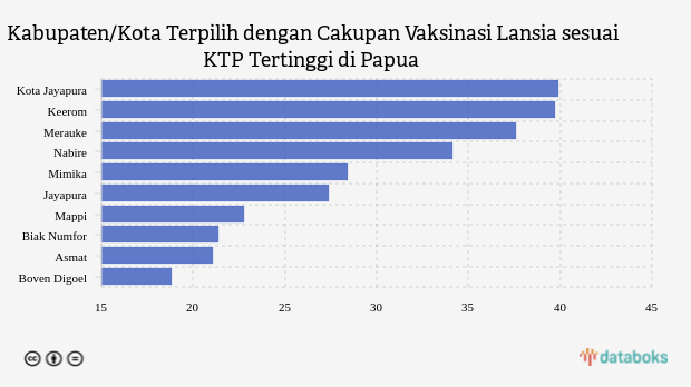 Kota jayapura berada di urutan pertama dengan cakupan vaksinasi lansia sesuai identitas KTP tertinggi sebesar 39,88 persen. Kondisi cakupan vaksinasi lansia sesuai identitas KTP di kota ini terlihat lebih baik dibandingkan pekan sebelumnya yang tercatat 39,79 persen.