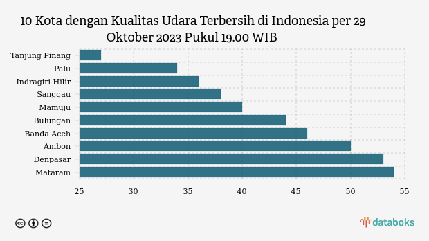 Berarti, pada Minggu (29/10/2023) pukul 19.00 WIB, kota dengan kualitas udara baik, yaitu Tanjung Pinang, Palu, Indragiri Hilir, Sanggau, Mamuju, Bulungan, Banda Aceh, dan Ambon. Adapun, 2 kota lainnya, yakni Denpasar dan Mataram memiliki kualitas udara sedang.