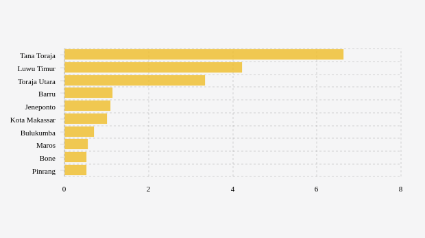 Masih di urutan lima besar selain dua wilayah di atas adalah Toraja Utara, Barru dan Jeneponto. Masing-masing mencatatkan jumlah konfirmasi mingguan sebanyak tiga kasus, 1,14 kasus dan 1,08 kasus.