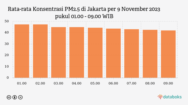 Konsentrasi PM2.5 udara Jakarta terendah berada di level 42,0 µg/m³ pada pukul 09.00 WIB, sedangkan konsentrasi PM2.5 tertinggi pada pukul 01.00 WIB dengan nilai 47,4 µg/m³.