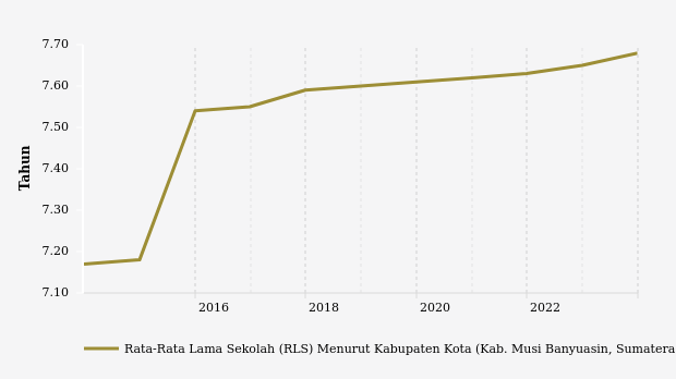 RLS penduduk Musi Banyuasin meningkat 0,03 tahun (0,39%) dibanding tahun sebelumnya yang selama 7,65 tahun. Sementara, dalam lima tahun terakhir RLS tersebut naik 0,08 tahun (1,05%).