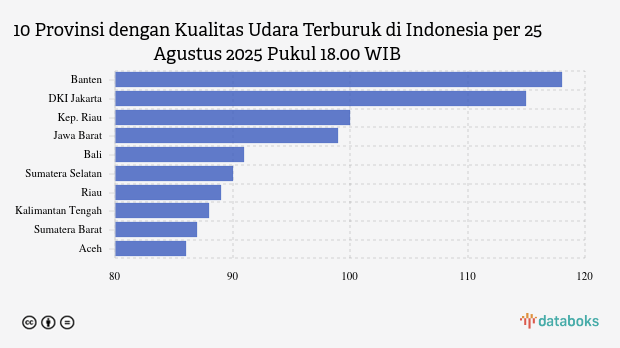 Berikut daftar 10 provinsi dengan indeks kualitas udara terburuk di Indonesia pada Senin, 25 Agustus 2025 pukul 18.00 WIB.