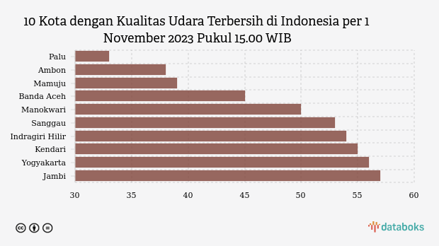 Berarti, pada Rabu (1/11/2023) pukul 15.00 WIB, kota dengan kualitas udara baik, yaitu Palu, Ambon, Mamuju, Banda Aceh, dan Manokwari. Adapun, 5 kota lainnya, yakni Sanggau, Indragiri Hilir, Kendari, Yogyakarta, dan Jambi memiliki kualitas udara sedang.