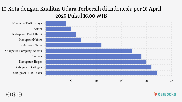 Kualitas udara Kabupaten Tasikmalaya sore ini paling bersih di Indonesia. Berdasarkan indeks kualitas udara versi Kementerian Lingkungan Hidup dan Kehutanan (KLHK), Kabupaten Tasikmalaya memiliki skor 4 pada Kamis (16/4/2026) pukul 16.00 WIB.
