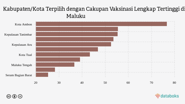 Kota ambon berada di urutan pertama dengan cakupan vaksinasi lengkap tertinggi sebesar 76,67 persen. Kondisi cakupan vaksinasi lengkap di kota ini terlihat lebih baik dibandingkan pekan sebelumnya yang tercatat 76,37 persen.