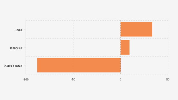 Secara persentase, lima negara teratas dengan penambahan kematian tertinggi yakni India, Indonesia dan Korea Selatan. Total kematian di lima negara tersebut per Minggu, 25 Juni 2023 sebanyak 38 jiwa dengan pertumbuhan mingguan di atas -87,93 persen.