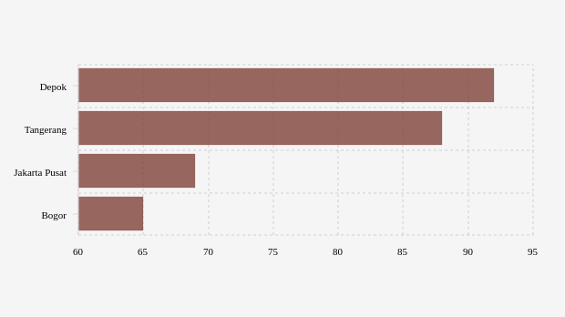 Di bawah kota Depok, ada Tangerang di urutan kedua dengan indeks kualitas udara 88. Selanjutnya, Jakarta Pusat menempati urutan ketiga dengan skor 69.