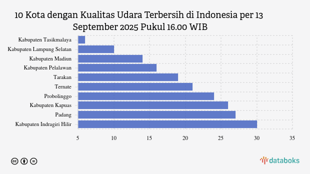 Kualitas udara Kabupaten Tasikmalaya pada Sabtu (13/9/2025) sore ini paling bersih di Indonesia.