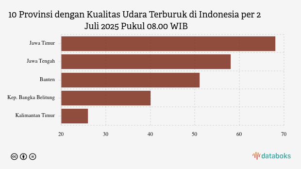 Berikut daftar 10 provinsi dengan indeks kualitas udara terburuk di Indonesia pada Rabu, 2 Juli 2025 pukul 08.00 WIB.