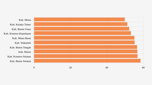 Kabupaten Muna di urutan pertama. Sampai dengan kemarin, untuk vaksinasi dosis 2 wilayah ini baru mencatatkan 49,79 persen. Angka ini menjadi yang terendah dibandingkan 17 kabupaten/kota lainnya. Sedangkan untuk pencapaian dosis 1, sampai dengan kemarin sudah tercapai 81,26 persen atau diikuti oleh 219,75 ribu peserta vaksin.