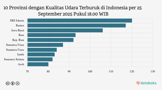 Berikut daftar 10 provinsi dengan indeks kualitas udara terburuk di Indonesia pada Kamis, 25 September 2025 pukul 18.00 WIB.