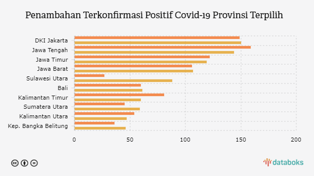 Provinsi DKI Jakarta mencatatkan penambahan kasus Covid-19 tertinggi, sebanyak 150 orang. Posisi Jakarta menggeser Jawa Tengah yang sebelumnya di urutan pertama. Dibandingkan kemarin, penambahan hari ini di Jakarta lebih tinggi satu kasus.