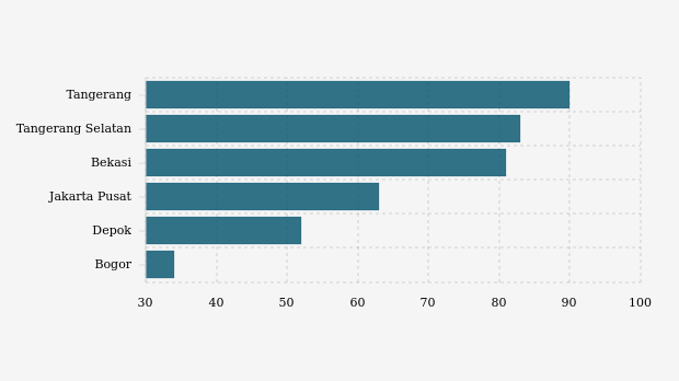 Di bawah kota Tangerang, ada Tangerang Selatan di urutan kedua dengan indeks kualitas udara 83. Selanjutnya, Bekasi menempati urutan ketiga dengan skor 81.
