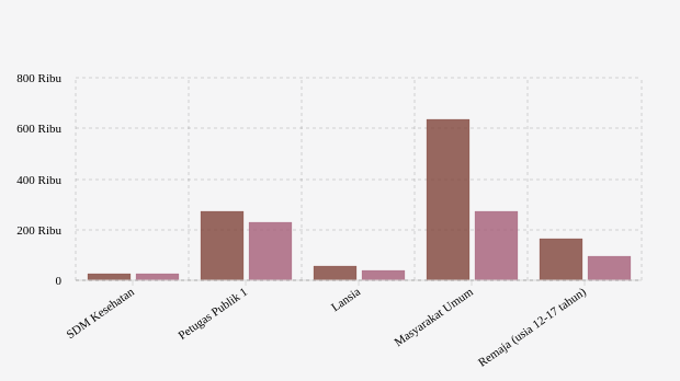 Vaksinasi ke petugas publik dengan target 198,97 ribu jiwa. Vaksinasi dosis 1 dilaporkan telah mencapai 270,42 ribu jiwa (135,91 persen target) dan dosis 2 dengan capaian 115,76 persen atau berhasil tersalurkan sebanyak 230,34 ribu jiwa.