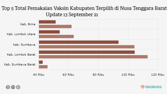 Kabupaten Bima di Nusa Tenggara Barat, telah menggunakan vaksin sebanyak 61,868 dosis vaksin per Senin, 13 September 2021. Jumlah ini tumbuh 20,58 persen dibandingkan penggunaan vaksin minggu kemarin yang baru di angka 51,310 dosis.