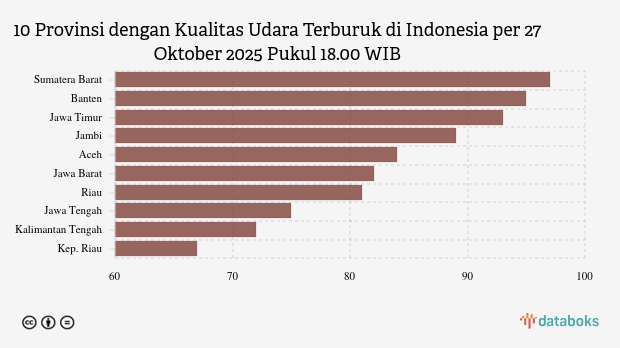 Berikut daftar 10 provinsi dengan indeks kualitas udara terburuk di Indonesia pada Senin, 27 Oktober 2025 pukul 18.00 WIB.