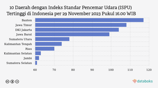 Berikut daftar 10 provinsi dengan indeks kualitas udara terburuk di Indonesia pada Rabu, 29 November 2023 pukul 16.00 WIB.
