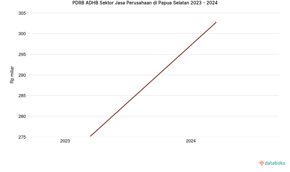 Badan Pusat Statistik (BPS) mencatat PDRB ADHB Sektor Jasa Perusahaan Provinsi Papua Selatan pada tahun 2024 mencapai Rp 302,75 miliar. Nilai ini menunjukkan pertumbuhan sebesar 10,05% atau meningkat Rp 27,65 miliar dibandingkan tahun 2023 yang tercatat sebesar Rp 275,1 miliar. Pertumbuhan ini menunjukkan perkembangan positif sektor jasa perusahaan di Papua Selatan.
