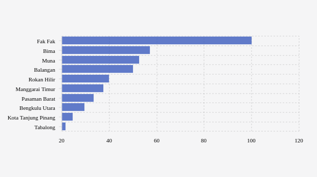 BOR khusus Covid-19 lima kabupaten/kota teratas dengan angka lebih dari 39,78 persen, yaitu Fak Fak, Bima, Muna, Balangan dan Rokan Hilir dengan masing-masing nilai 100 persen, 57,14 persen, 52,5 persen, 50 persen dan 39,78 persen.