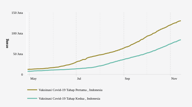 Vaksinasi covid-19 secara nasional hingga Minggu, 14 November 2021 telah mencapai 216,87 juta dosis vaksin. Rinciannya, vaksinasi dosis 1 telah diberikan sebanyak 130,36 juta dosis, 84,19 juta untuk dosis 2 dan sebanyak 2,32 juta dosis lainnya untuk vaksinasi gotong royong.