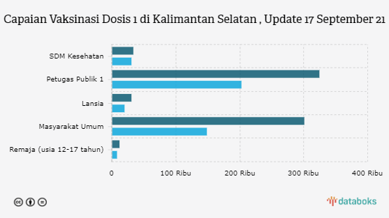 Cakupan vaksinasi dosis 1 di provinsi Kalimantan Selatan, hingga kemarin Jumat, 17 September 2021, telah mencapai 22,95 persen. Angka ini setara dengan 725,4 ribu peserta vaksin dari target yang ditetapkan sebanyak 3.16 juta orang. Sementara untuk vaksinasi dosis 2 hingga kemarin telah tercapai 13,44 persen dari target.