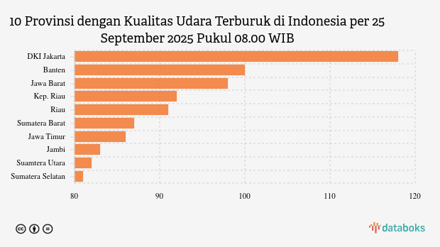 Berikut daftar 10 provinsi dengan indeks kualitas udara terburuk di Indonesia pada Kamis, 25 September 2025 pukul 08.00 WIB.
