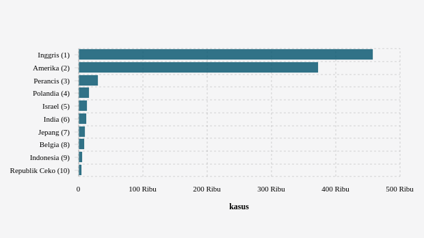 Selanjutnya, Perancis dengan jumlah kasus Omicron 30.039 kasus (naik 45,76%), Polandia dengan jumlah kasus Omicron 15.588 kasus (naik 53,02%) dan Israel dengan jumlah kasus Omicron 13.225 kasus (naik 35,77%)