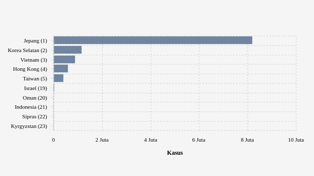 Sementara itu di urutan teratas dengan kasus aktif tertinggi di Asia adalah Japan. Negara ini mencatatkan kasus aktif sebanyak 8,18 juta orang. Kemudian S. Korea ada di urutan kedua. S. Korea mencatatkan kasus aktif sebanyak 1,14 juta orang.