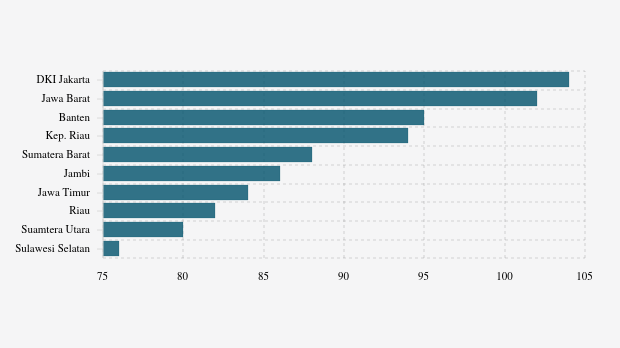 Di bawah DKI Jakarta, ada Jawa Barat yang menempati posisi kedua terburuk di Indonesia dengan indeks kualitas udara 102. Kemudian, di posisi ketiga ada Banten dengan indeks kualitas udara 95.