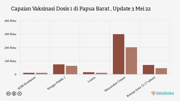 Cakupan vaksinasi dosis 1 di provinsi Papua Barat, hingga kemarin Selasa, 3 Mei 2022, telah mencapai 62,89 persen. Angka ini setara dengan 501,47 ribu peserta vaksin dari target yang ditetapkan sebanyak 797,4 ribu orang. Sementara untuk vaksinasi dosis 2 hingga kemarin telah tercapai 44,34 persen dari target.