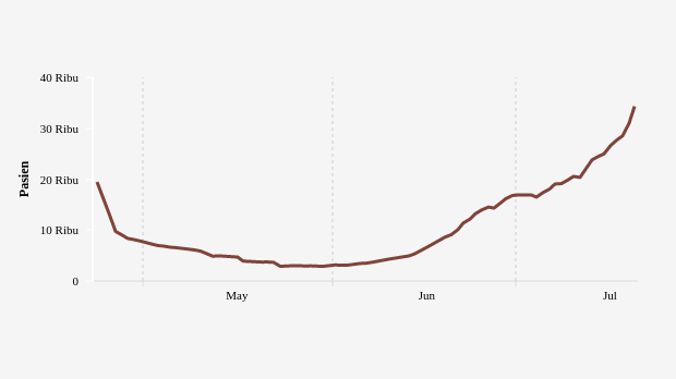 Kasus aktif Covid-19 di Indonesia saat ini kembali mulai naik. Berdasarkan laporan Satgas Penanganan Covid-19, jumlah kasus aktif Covid-19 di Indonesia kini ada 34.301 kasus aktif per Rabu, 20 Juli 2022.