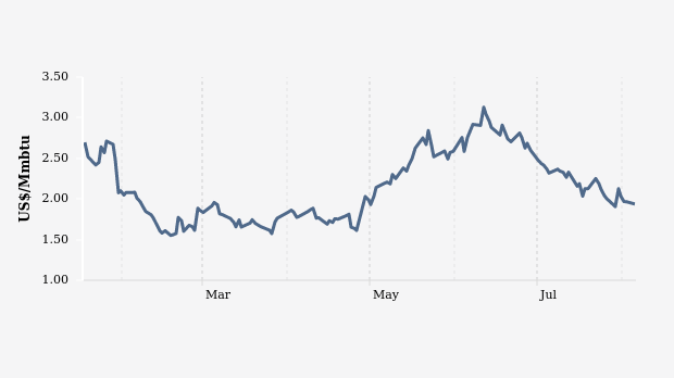 Seminggu terakhir, pergerakan harga gas alam dunia tumbuh -6,08 persen dengan rata-rata harga transaksi harian adalah US$ 1,99 per mmbtu. Sedangkan dibanding posisi 30 hari yang lalu, pergerakan harga gas alam dunia telah tumbuh -31,8 persen. Bahkan dari harga tertingginya tahun ini di US$ 3,31 per mmbtu, harga gas alam dunia telah turun 42.14 persen.