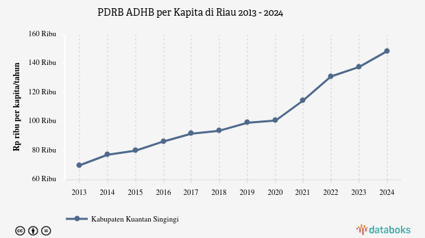 Badan Pusat Statistik (BPS) mencatat Produk Domestik Regional Bruto (PDRB) Atas Dasar Harga Berlaku (ADHB) per kapita Kabupaten Kuantan Singingi pada tahun 2024 sebesar Rp148.878 ribu per kapita/tahun. Angka ini menunjukkan pertumbuhan positif dibandingkan tahun sebelumnya, dengan kenaikan sebesar 7,98% atau Rp11.004 ribu per kapita/tahun. Secara historis, PDRB ADHB per kapita di Kuantan Singingi terus mengalami peningkatan dari tahun 2013 hingga 2024.