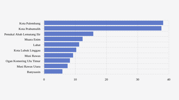 Masih di urutan lima besar selain dua wilayah di atas adalah Penukal Abab Lematang Ilir, Muara Enim dan Lahat. Masing-masing mencatatkan jumlah konfirmasi mingguan sebanyak 15,71 kasus, 12,36 kasus dan 11,19 kasus.