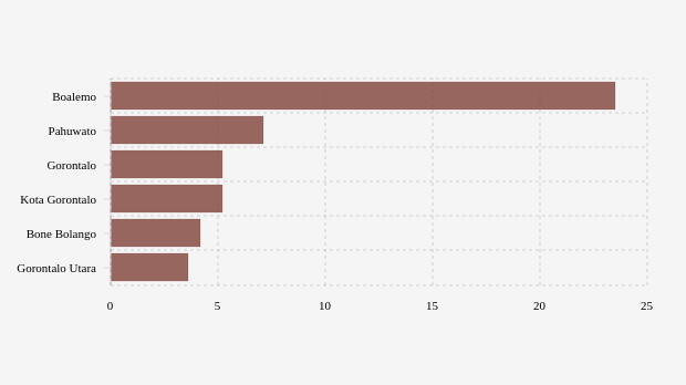 Kondisi yang sama terjadi di Pahuwato yang mencatatkan positivity rate tujuh hari terakhir sebesar 7,14 persen. Di kabupaten ini, positivity rate tujuh hari terakhir juga terlihat lebih tinggi dibandingkan pekan sebelumnya yang baru 4,35 persen. Di urutan berikutnya Gorontalo. Kabupaten di provinsi Gorontalo ini mencatatkan positivity rate tujuh hari terakhir sebesar 5,19 persen