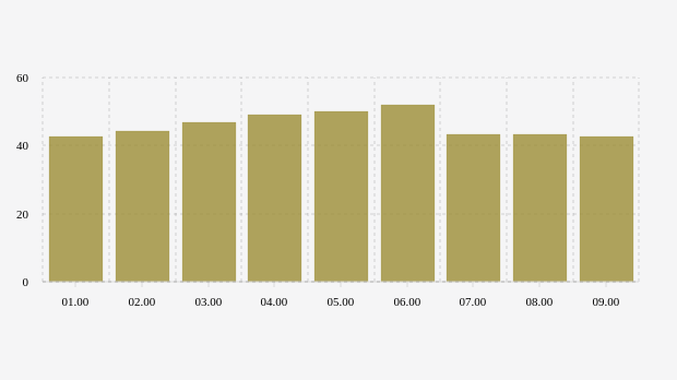 Konsentrasi PM2.5 udara Jakarta terendah berada di level 42,6 µg/m³ pada pukul 01.00 WIB, sedangkan konsentrasi PM2.5 tertinggi pada pukul 06.00 WIB dengan nilai 52,1 µg/m³.