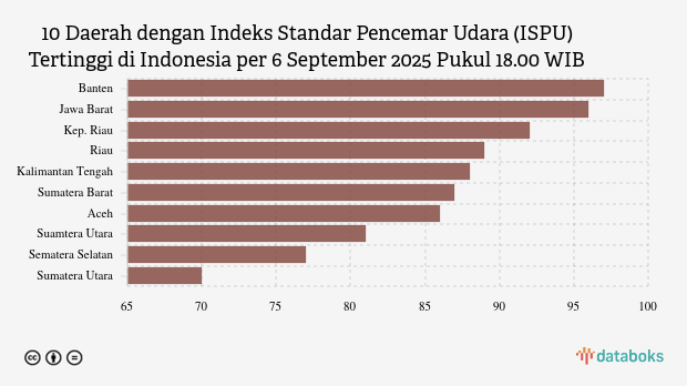 Berikut daftar 10 provinsi dengan indeks kualitas udara terburuk di Indonesia pada Sabtu, 6 September 2025 pukul 18.00 WIB.