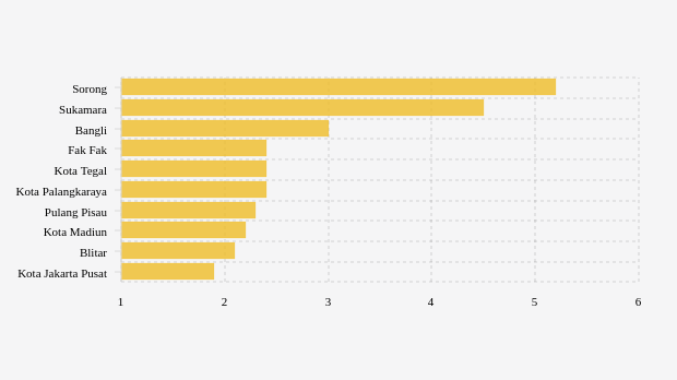 Penggunaan rawat inap lima kabupaten/kota teratas dengan angka lebih dari 2,4 pasien per 100 ribu penduduk/minggu, yaitu Sorong, Sukamara, Bangli, Fak Fak dan kota Tegal dengan masing-masing nilai 5,21 pasien per 100 ribu penduduk/minggu, 4,48 pasien per 100 ribu penduduk/minggu, 3,03 pasien per 100 ribu penduduk/minggu, 2,42 pasien per 100 ribu penduduk/minggu dan 2,4 pasien per 100 ribu penduduk/minggu.