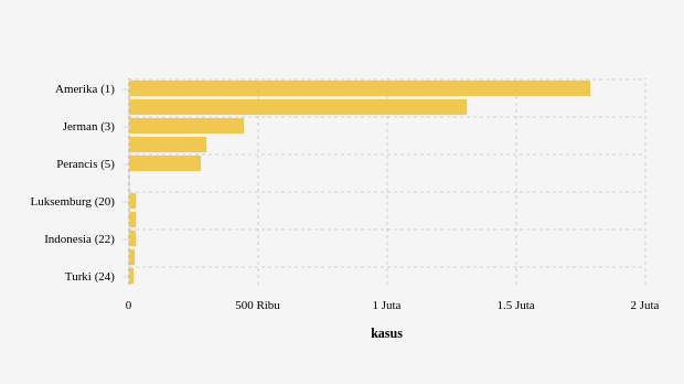 Selanjutnya, jumlah kasus Omicron di Jerman naik 0,87 persen menjadi 445,25 ribu kasus dibandingkan pekan sebelumnya, jumlah kasus Omicron di Denmark naik 1,55 persen menjadi 299,89 ribu kasus dibandingkan pekan sebelumnya dan Perancis dengan jumlah kasus Omicron 277,7 ribu kasus (naik 0,86%)