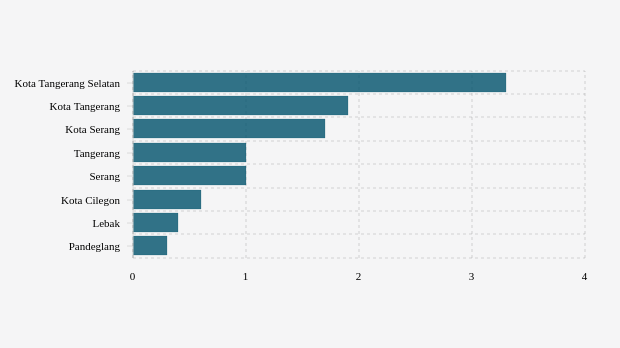 Kota tangerang selatan berada di urutan pertama dengan positivity rate tujuh hari terakhir tertinggi sebesar 3,26 persen. Kondisi positivity rate tujuh hari terakhir di kota ini terlihat belum membaik karena terjadi peningkatan dibandingkan pekan sebelumnya yang tercatat 2,65 persen.