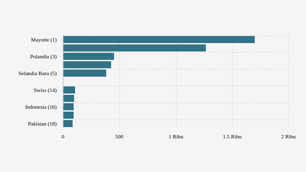 Selanjutnya, penambahan kasus Omicron di Polandia naik 450,21 persen menjadi 1.315 kasus dibandingkan pekan sebelumnya, Slovenia dengan penambahan kasus Omicron 1.619 kasus (naik 423,95%) dan penambahan kasus Omicron di Selandia Baru naik 382,05 persen menjadi 376 kasus dibandingkan pekan sebelumnya