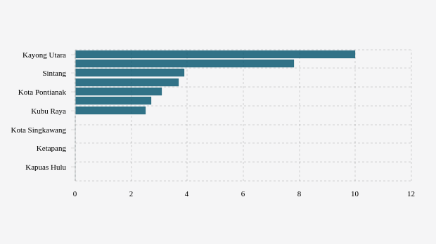 Kayong utara adalah kabupaten di urutan pertama dengan positivity rate tujuh hari terakhir tertinggi sebesar 10 persen. Kondisi positivity rate tujuh hari terakhir di kabupaten ini memperlihatkan ada kemajuan dengan adanya penurunan dibandingkan pekan sebelumnya yang tercatat 11,11 persen.