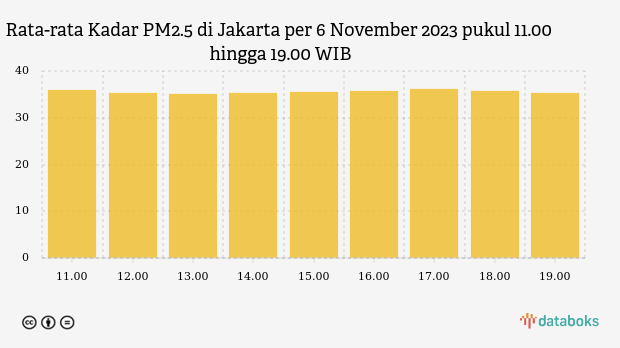 Konsentrasi PM2.5 udara Jakarta terendah berada di level 35,1 µg/m³ pada pukul 13.00 WIB, sedangkan konsentrasi PM2.5 tertinggi pada pukul 17.00 WIB dengan nilai 36,2 µg/m³.