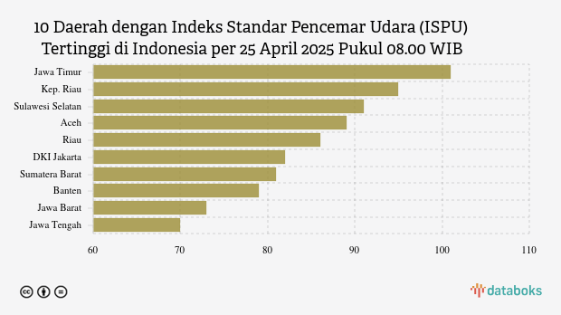 Berikut daftar 10 provinsi dengan indeks kualitas udara terburuk di Indonesia pada Jumat, 25 April 2025 pukul 08.00 WIB.